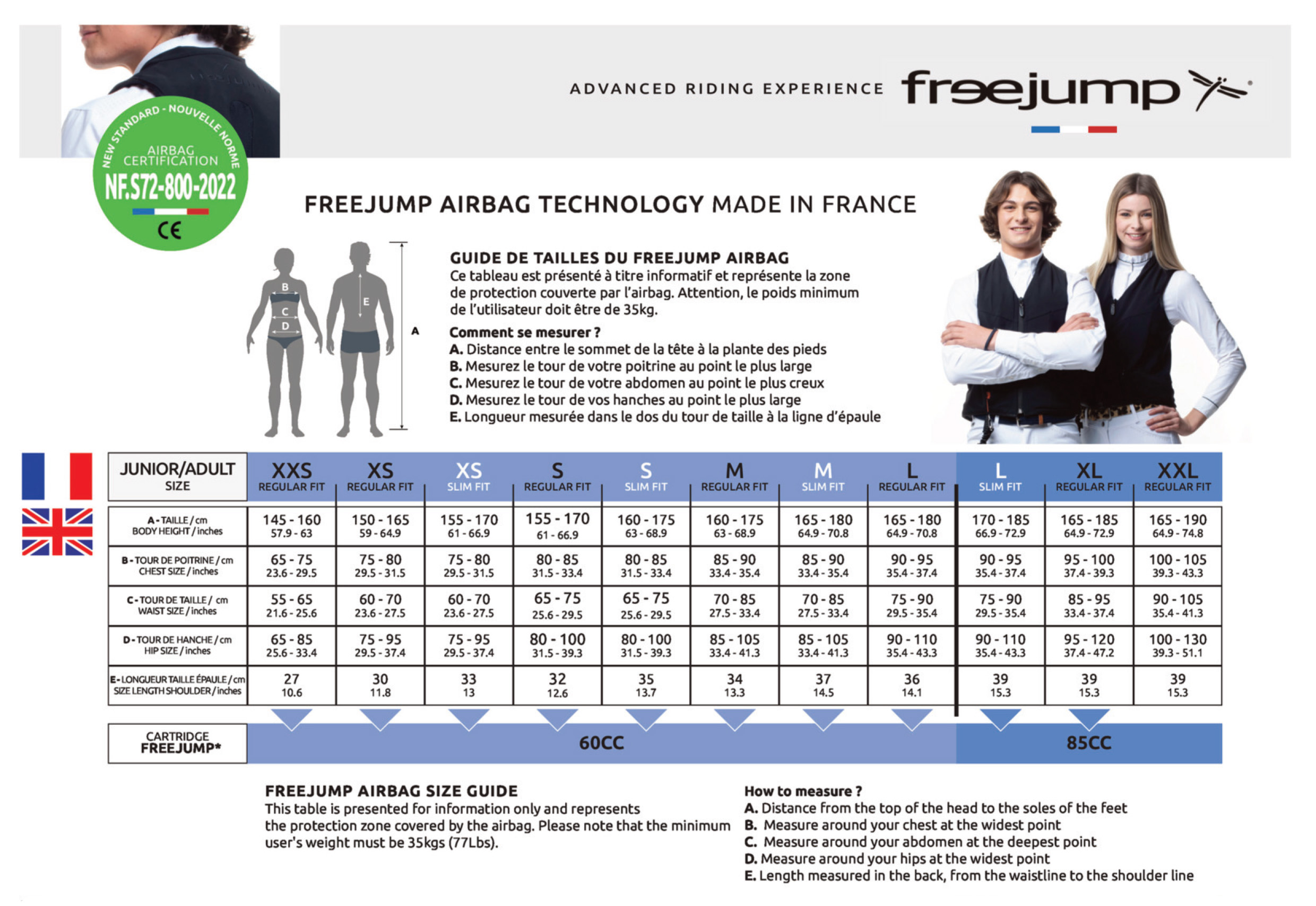 Stay safe while riding with the Freejump Airbag Vest. This innovative vest features an airbag system that inflates in the event of a fall, providing protection to the rider’s vital organs. Made from high-quality materials and designed for comfort and ease of use, the Freejump Airbag Vest is a must-have for any rider. The AIRBAG FREEJUMP vest is the first airbag vest made for horseback riding to have been approved by the NF S72- 800-202 standard. The Freejump Airbag is the result of Freejump's taste for innovation, and their concern for the performance, comfort and safety of riders. Horseback riding is a dangerous sport, whether it is recreational or high level. Martin Fuchs has been leading the way since July 2019 (CHIO Aachen) using the Freejump Airbag. The Airbag Freejump is a protective vest made for horse riding and is worn close to the body, over a thin layer of clothing (T-shirt, sweater or thin pullover …). It allows to protect the vital zones of the rider.