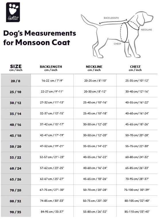 The Hurtta Monsoon raincoat is an essential outfit for every dog in rainy, windy, or muddy weather. Monsoon’s collar seams are vertical, allowing the collar to be taped so that it is fully waterproof and the entirely new technical structure of the collar means that the seams can be taped even more comprehensively than before. In addition, there is a rain collar made of waterproof tricot around the edge of the collar, preventing water from going inside the coat along the dog’s neck. The comfortably soft collar can be tightened up around the dog’s neck to protect the chest and neck area. The large reflective prints on the coat’s rear hem improve visibility in the dark. The wide belly flap keeps the coat in place, ensuring that it stays on without restricting the dog’s movement, even during boisterous play. The flap covers the dog’s belly and efficiently protects it from mud and sand.